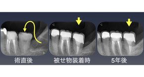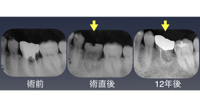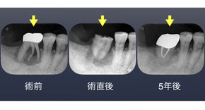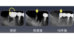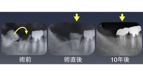 右下第一大臼歯を抜歯し近心根(前方の根)を遠心根へ移植した。